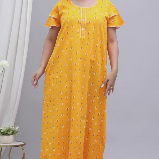 Bright Yellow Pure Cotton Printed Nighty Maxi with Side Pocket | Soft & Breathable Women’s Nightgown