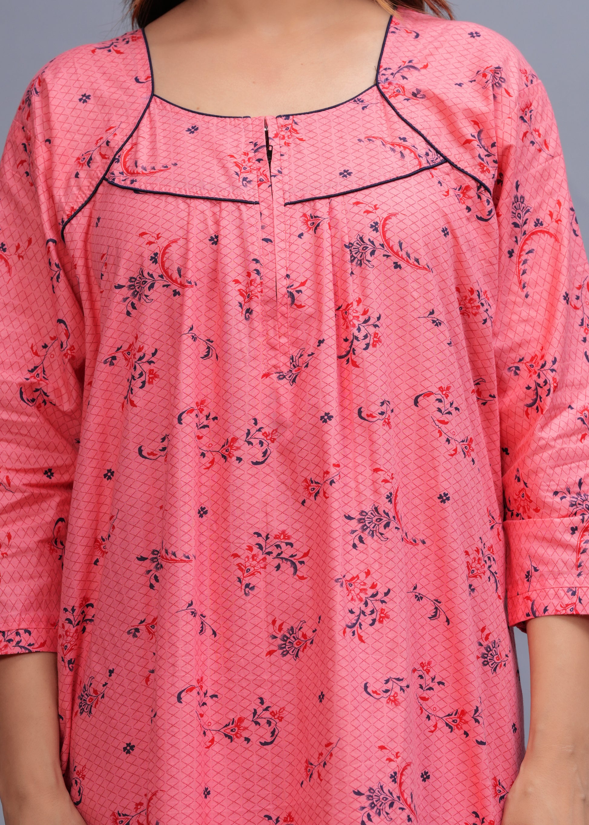 Experience the ultimate comfort and style with this full-length nightgown from HARGUN NIGHT WEAR. Crafted from soft, breathable cotton fabric, this elegant nightdress features a beautiful allover floral print in shades of green and red. The loose, flowy silhouette with full sleeves offers a relaxed and feminine fit, perfect for a restful night's sleep or lounging at home. Designed with attention to detail, this nightgown is a versatile and timeless addition to your sleepwear collection. Available in a range of sizes, it's an ideal choice for women seeking comfort and sophistication. Pair it with slippers for a cosy and chic look.
