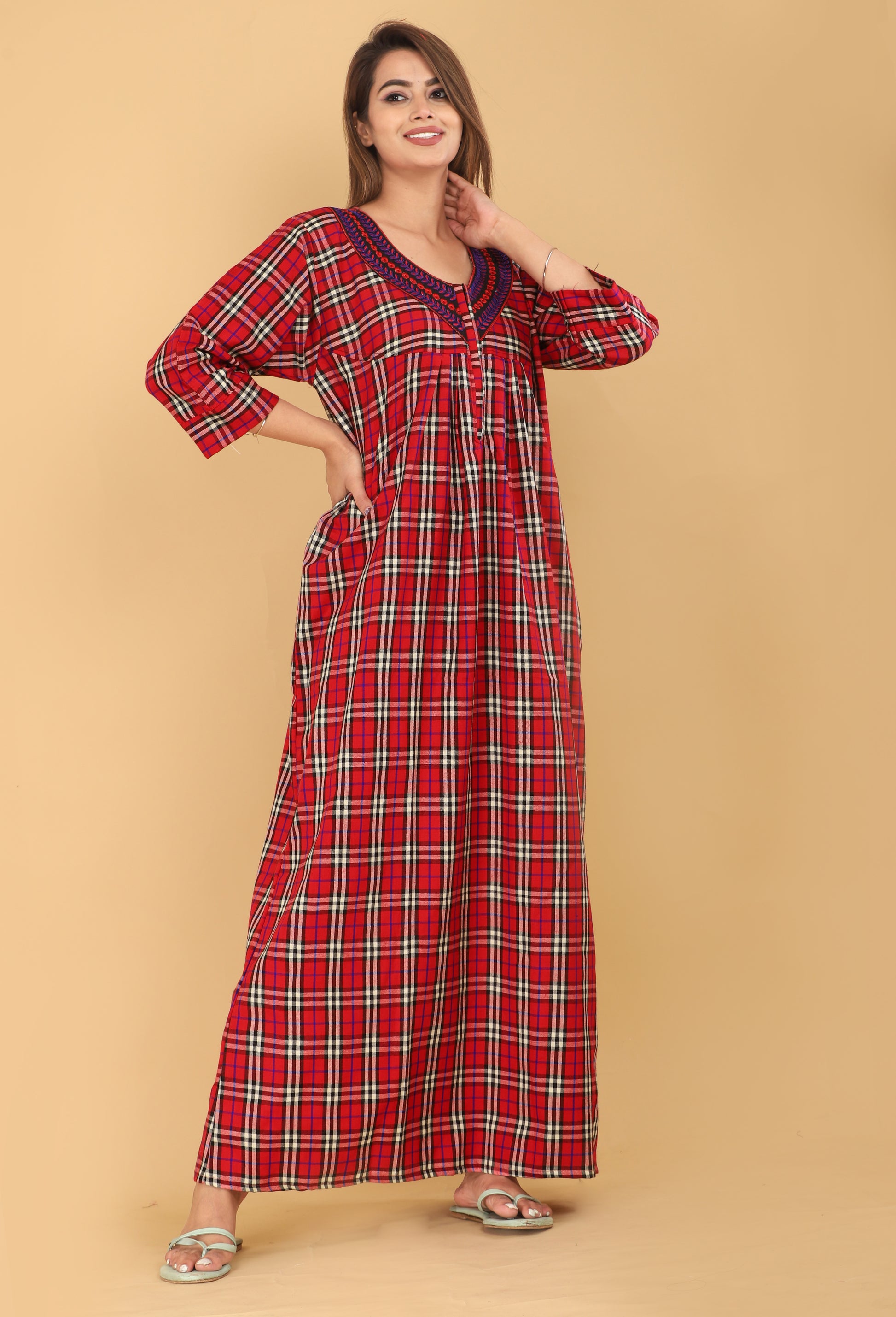 This stylish cottswool cotton and wool blend nightgown for women is perfect for the winter season. Featuring a classic plaid pattern in vibrant red and black hues, it offers a cosy and comfortable fit with its long sleeves. The loose silhouette allows for ease of movement, making it an ideal choice for lounging at home or as sleepwear. The soft cotton fabric ensures breathability and warmth throughout the night. With its timeless design and quality craftsmanship, this nightgown is a practical and fashionable addition to your winter wardrobe.