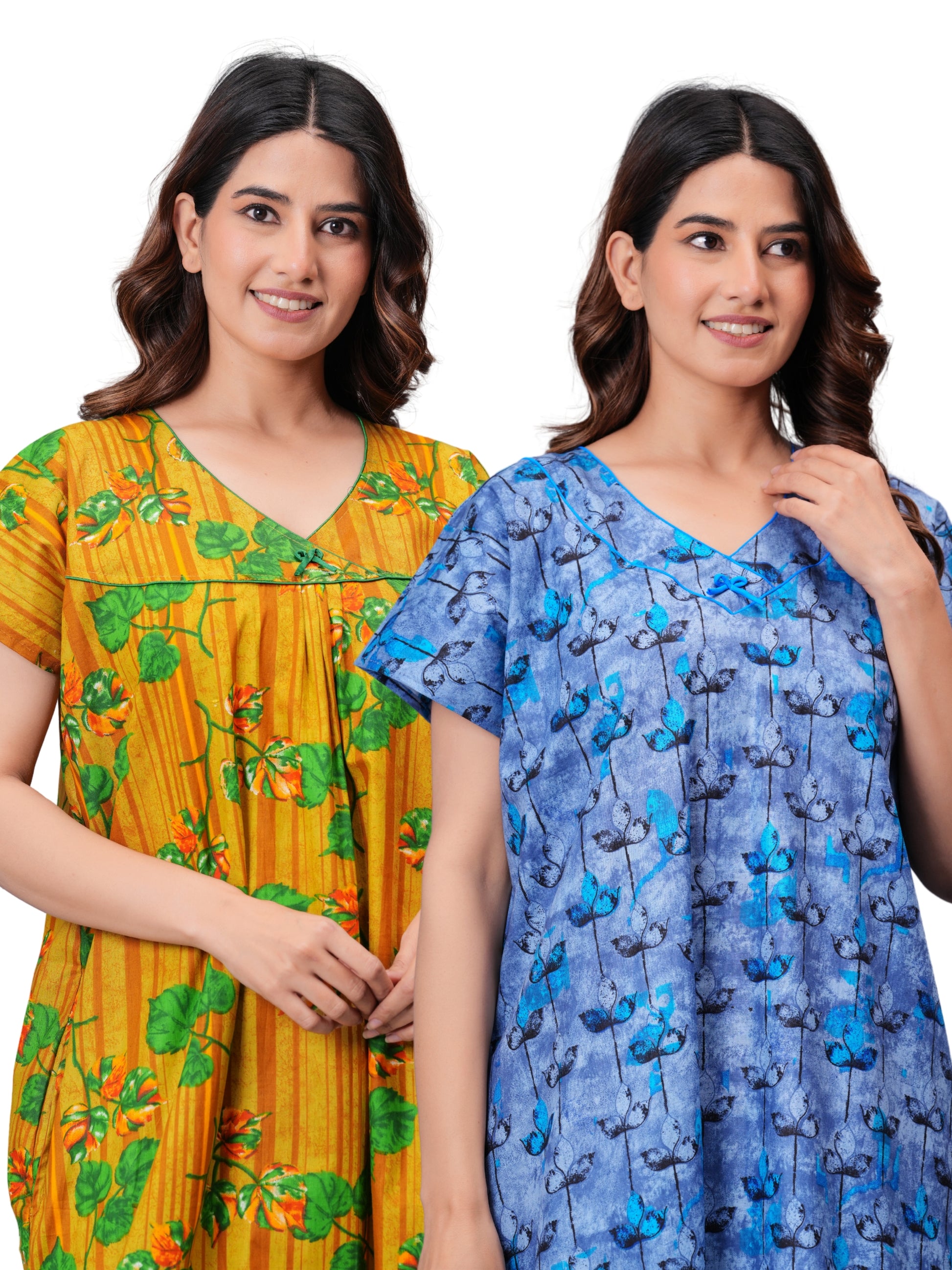 Discover ultimate comfort and effortless style with the Women's Floral Print Cotton NightDress. Made from soft, breathable cotton, this stylish night dress offers a relaxed fit that’s perfect for lounging at home, casual outings, or even as a cozy sleepwear option. The floral print design adds a burst of color, making it a vibrant and eye-catching choice for any occasion. This cotton night dress is designed with a loose, comfortable fit that flatters all body types, and it's available in a wide range of sizes, including plus sizes, ensuring the perfect fit for every woman. Whether you’re relaxing at home or meeting friends, this versatile dress is a wardrobe staple that offers both style and comfort. The Women's Floral Print nighty Dress is not only beautiful but also easy to care for. It’s machine washable, ensuring long-lasting durability and vibrant color retention even after multiple washes. Pair it with sandals for a day of relaxation or dress it up with accessories for a casual night out. Perfect for all-day wear, this comfortable cotton dress is the go-to choice for women who love a mix of ease, elegance, and versatility. Add the Women's Floral Print Cotton Kaftan Dress to your wardrobe today and experience the ultimate in relaxed style ?? Combo Includes: – 1 x Blue Floral Cotton Nighty – 1 x Mustard Floral Cotton Nighty ?? Care Instructions: – Gentle machine wash or hand wash – Do not bleach – Dry in shade for lasting color