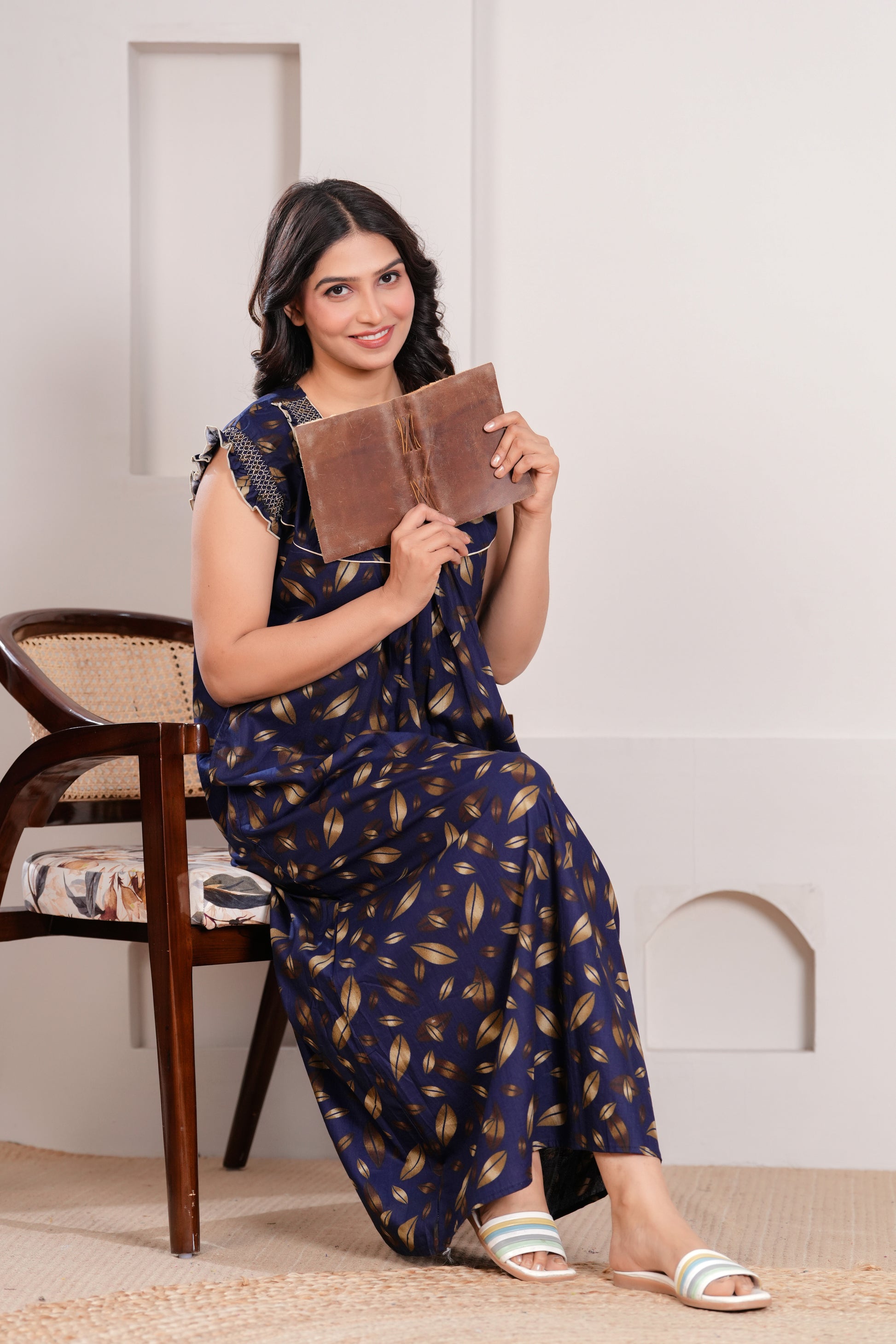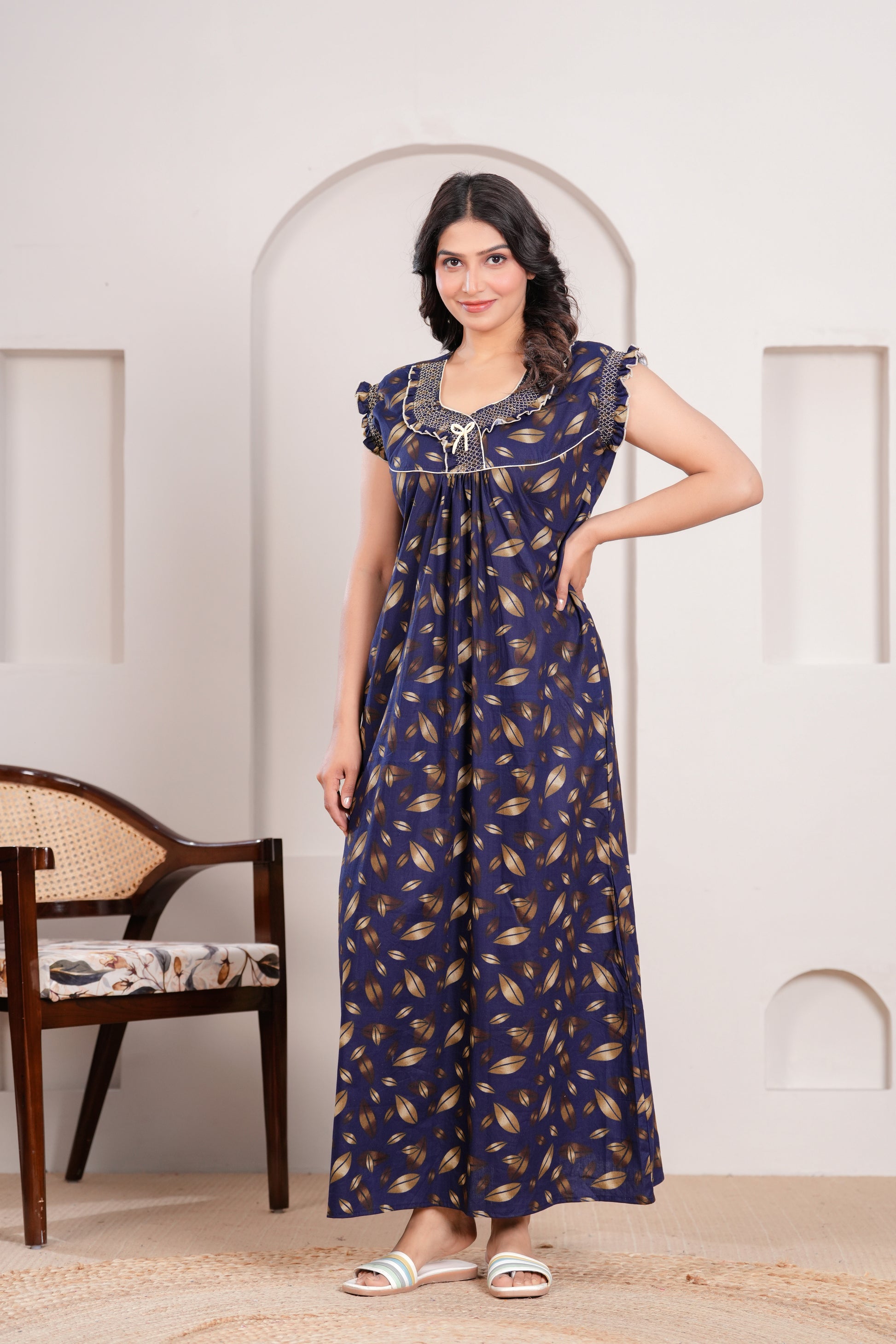 Experience the perfect blend of comfort, style, and functionality with the HARGUN NIGHT WEAR Women's Cotton Nightgown. Designed for luxurious sleep and cozy lounging, this full-length nighty is crafted from soft, breathable cotton fabric, ensuring maximum comfort throughout the night. Featuring an elegant embroidered neck design with delicate lacework, this stylish nightwear enhances your look while maintaining ultimate relaxation. The short ruffled sleeves add a feminine touch, while the convenient inside pocket provides practicality, allowing you to keep small essentials close. The navy blue fabric with golden leaf prints gives a sophisticated and premium look, making it an excellent choice for women's sleepwear and loungewear.