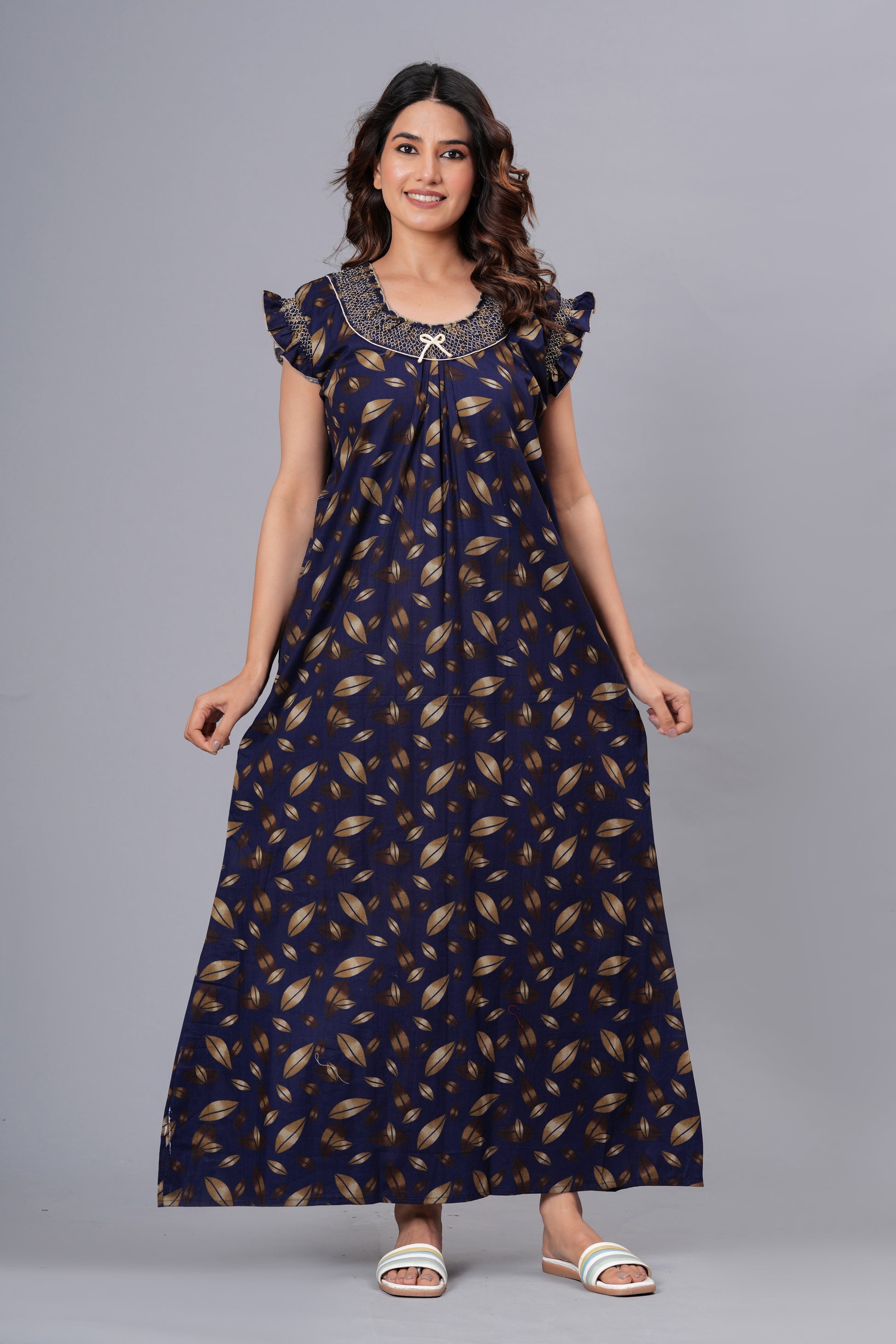 Experience the perfect blend of comfort, style, and functionality with the HARGUN NIGHT WEAR Women's Cotton Nightgown. Designed for luxurious sleep and cozy lounging, this full-length nighty is crafted from soft, breathable cotton fabric, ensuring maximum comfort throughout the night. Featuring an elegant embroidered neck design with delicate lacework, this stylish nightwear enhances your look while maintaining ultimate relaxation. The short ruffled sleeves add a feminine touch, while the convenient inside pocket provides practicality, allowing you to keep small essentials close. The navy blue fabric with golden leaf prints gives a sophisticated and premium look, making it an excellent choice for women's sleepwear and loungewear.